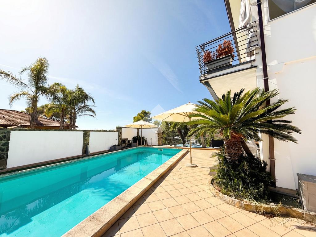 Piano Terra: un ampio living con cucina all’americana e luminose vetrate sul giardino e sul mare, una camera matrimoniale con cabina armadi, due bagni, lavanderia e ripostiglio. Il portico si apre sulla splendida area relax con piscina scenografica (10x4 m, copertura automatica), zona solarium, idromassaggio e doccia esterna: un’oasi privata di benessere.