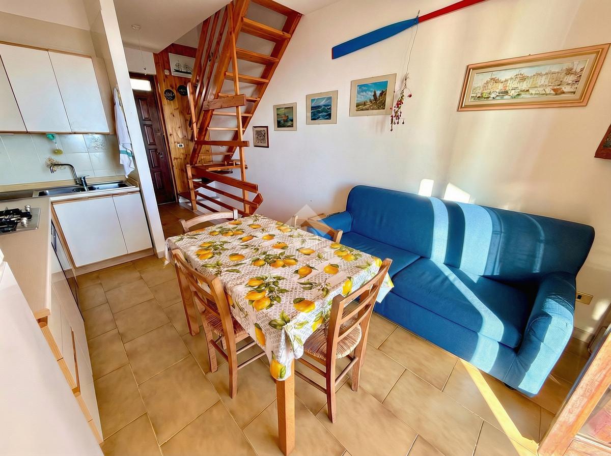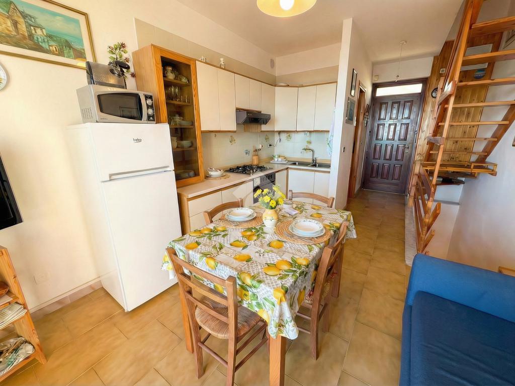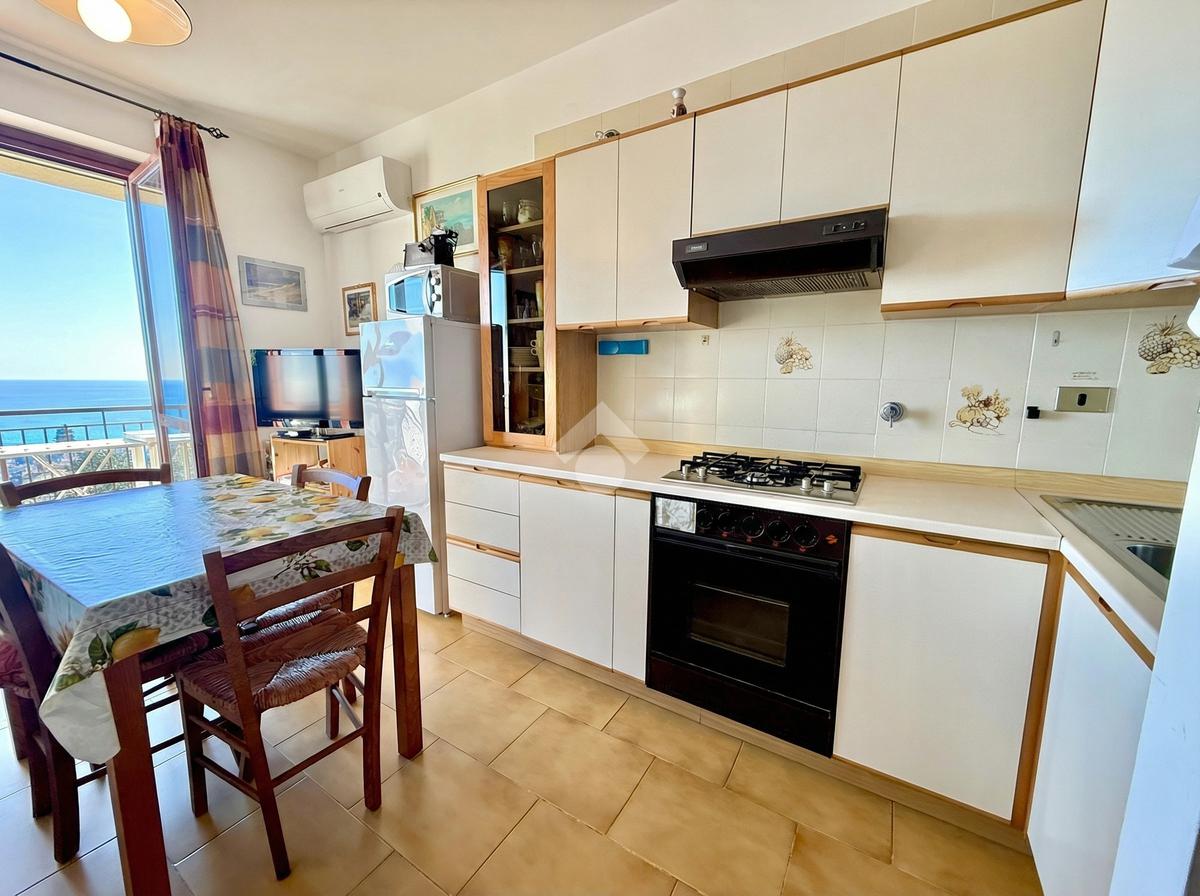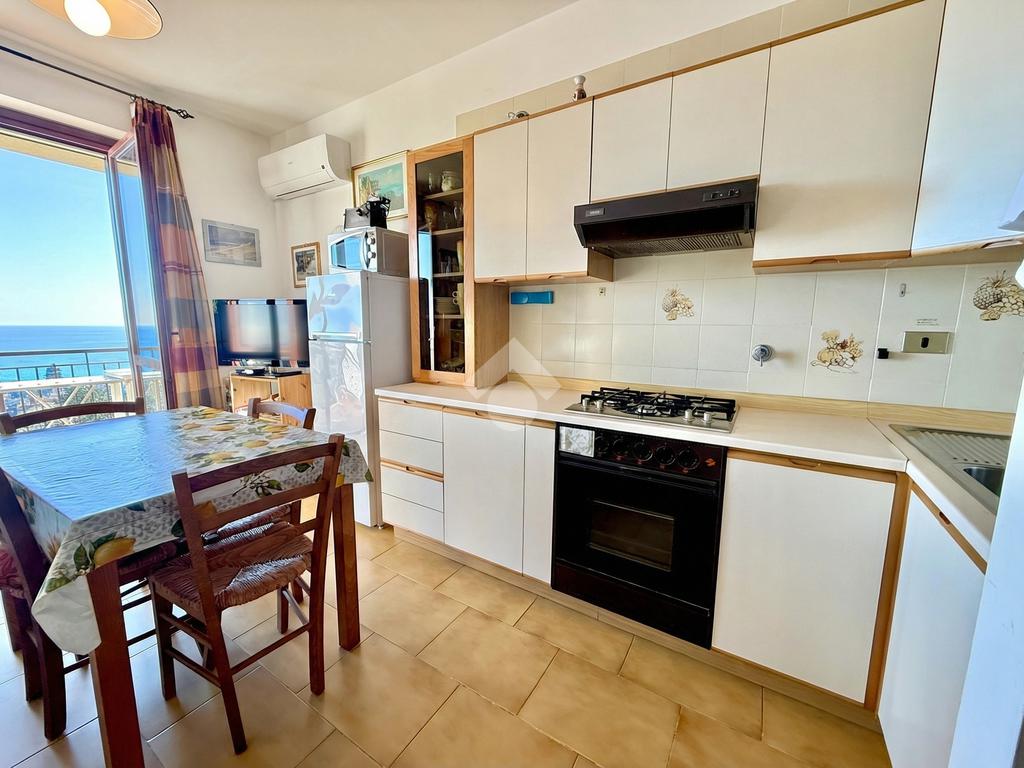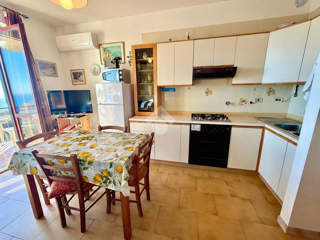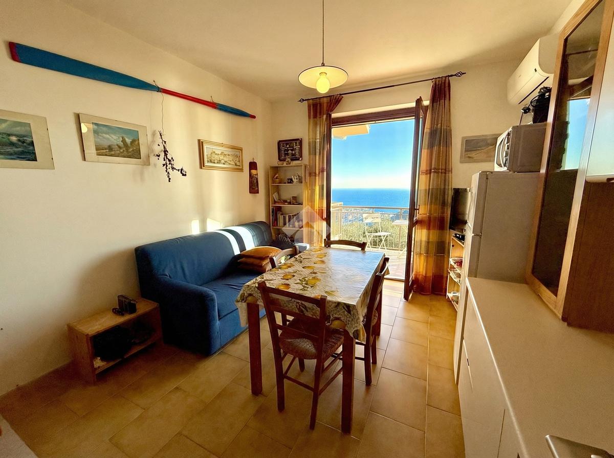 L'ingresso dell'abitazione conduce direttamente in un luminoso soggiorno dotato di angolo cottura separato, abbellito da un'ampia porta finestra che si apre su un ampio terrazzo con vista panoramica sulla collina, fino ad arrivare al mare scintillante. Sullo stesso livello si trova anche un bagno con finestra.