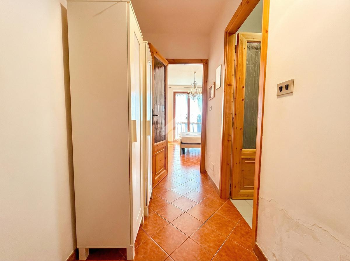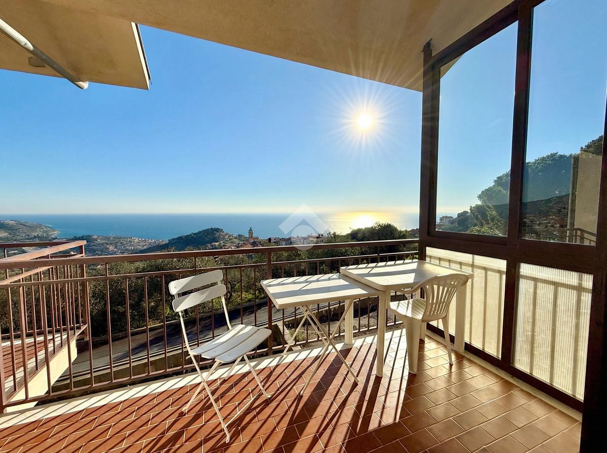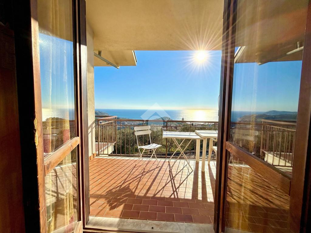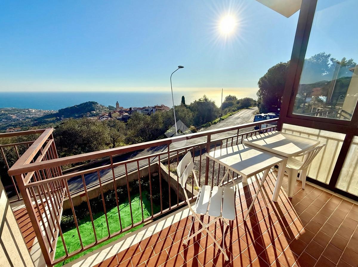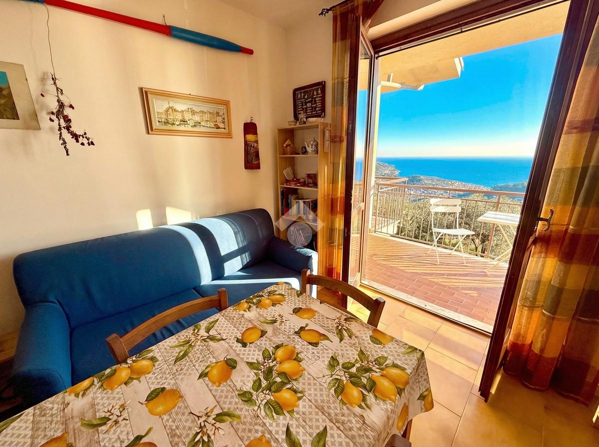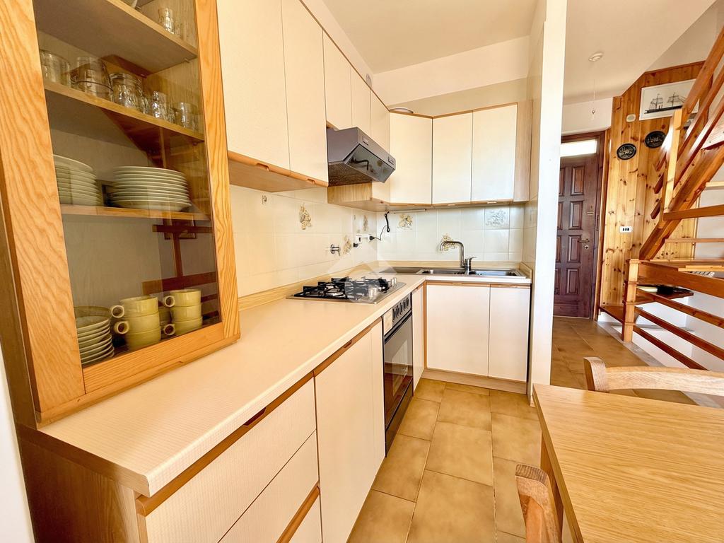 L'ingresso dell'abitazione conduce direttamente in un luminoso soggiorno dotato di angolo cottura separato, abbellito da un'ampia porta finestra che si apre su un ampio terrazzo con vista panoramica sulla collina, fino ad arrivare al mare scintillante. Sullo stesso livello si trova anche un bagno con finestra.