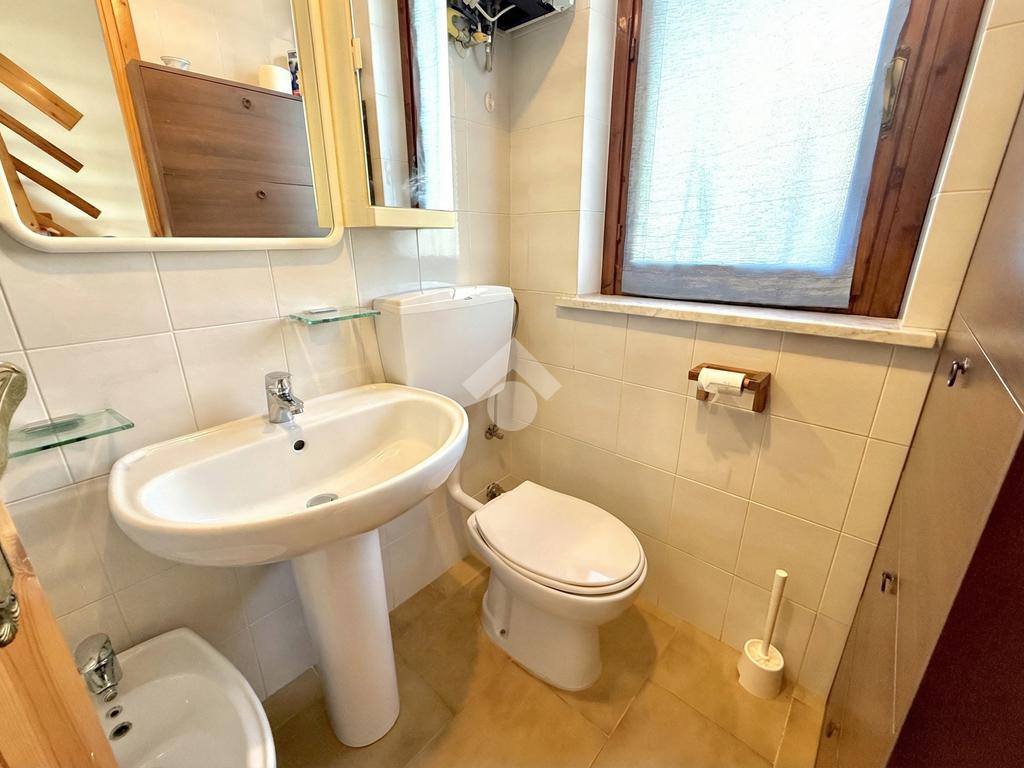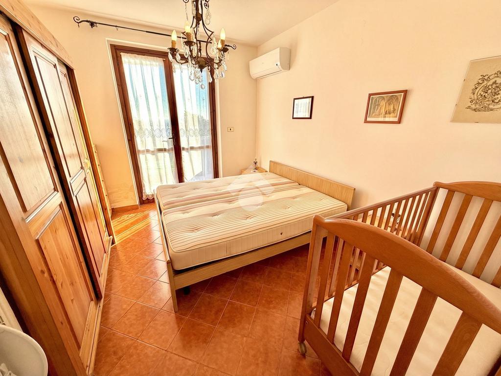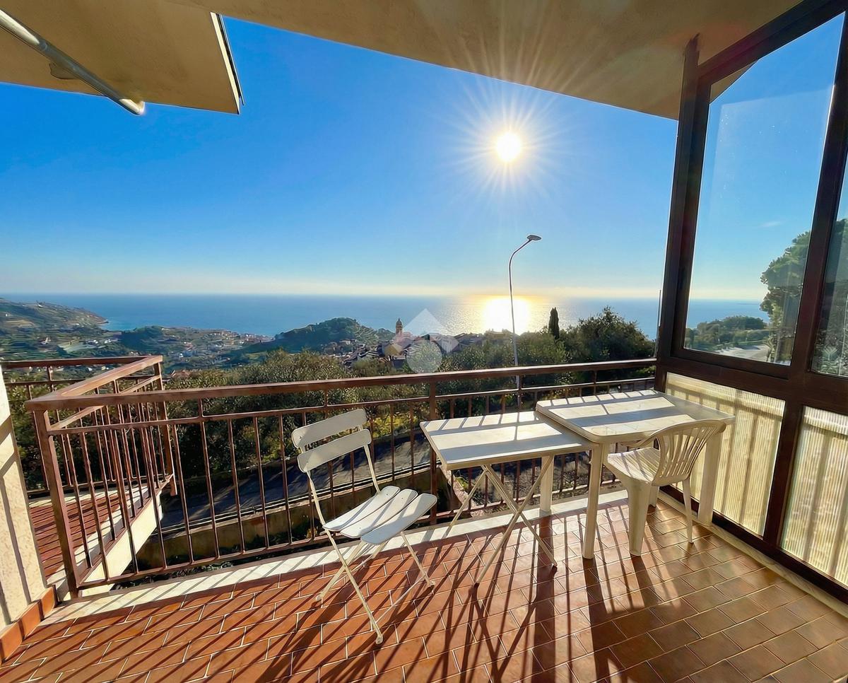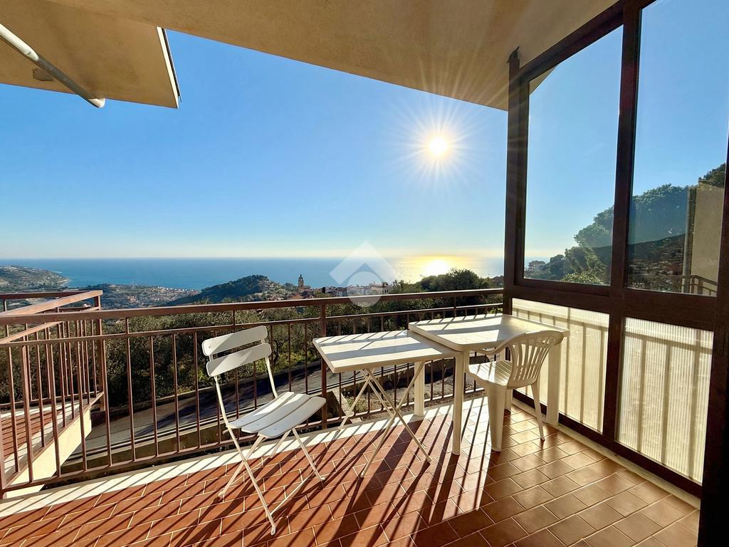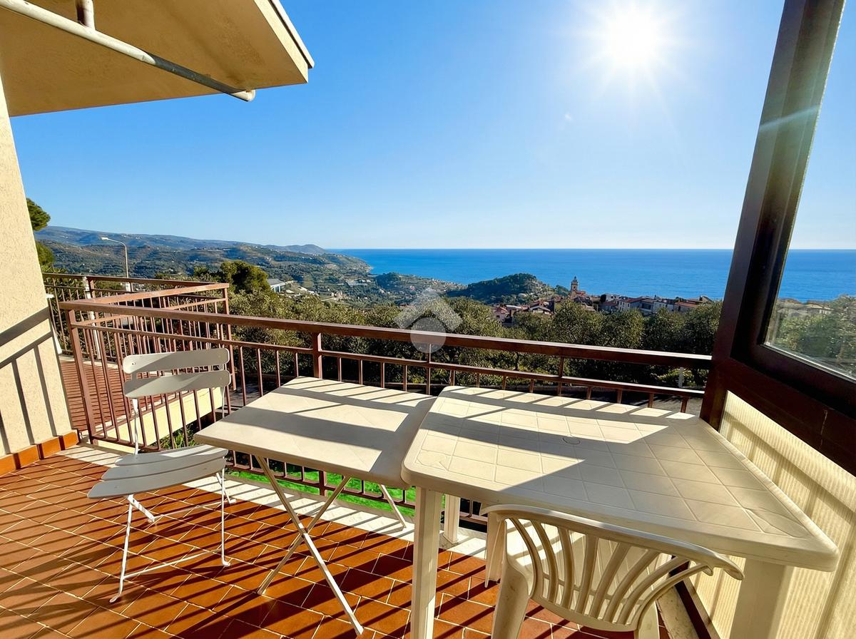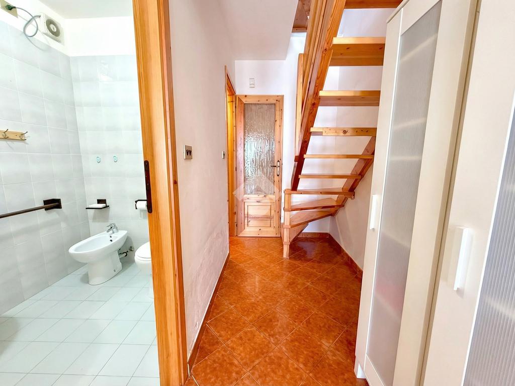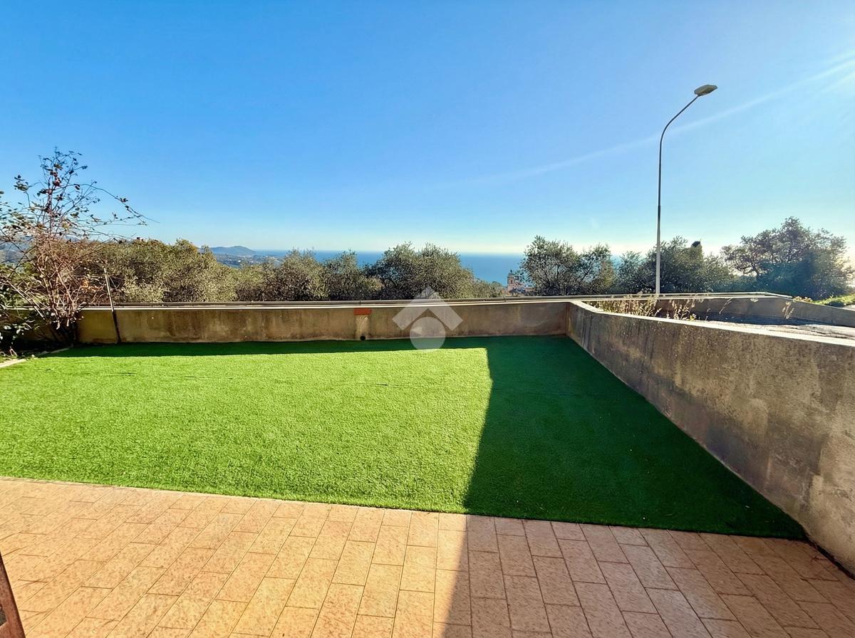 L'ingresso dell'abitazione conduce direttamente in un luminoso soggiorno dotato di angolo cottura separato, abbellito da un'ampia porta finestra che si apre su un ampio terrazzo con vista panoramica sulla collina, fino ad arrivare al mare scintillante. Sullo stesso livello si trova anche un bagno con finestra.