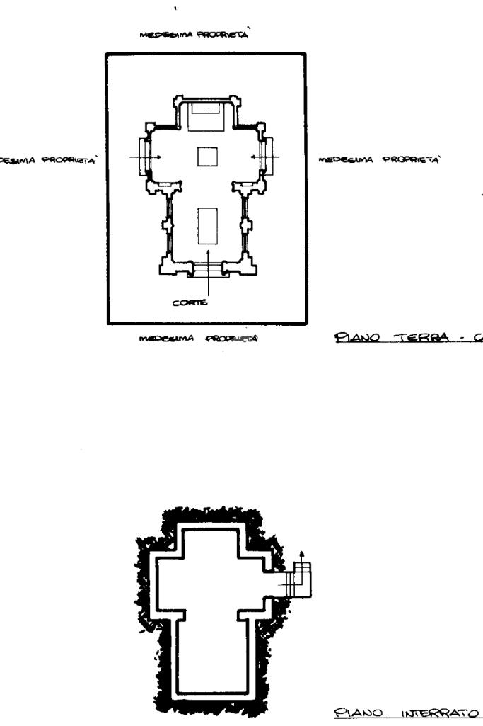 Suggestivo collegamento sotterraneo che conduce a una grotta artificiale con vasi in terracotta e alla cripta chiusa da porta in ferro decorata